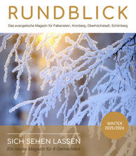 Ende November erscheint erstmals der RUNDBLICK – das gemeinsame Magazin der Gemeinden Falkenstein, Kronberg, Oberhöchstadt und Schönberg. Verteilt wir das neue Magazin im DIN A5-Format über die Königsteiner Woche und den Kronberger Boten. Also achten Sie bitte Ende November ganz besonders auf die Beilagen der Wochenzeitung in ihrem Briefkasten! Weitere Exemplare sind dann auch über das Gemeindebüro erhältlich und liegen in der Kirche aus.